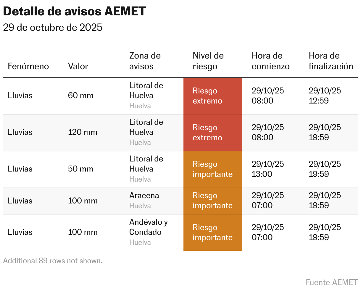 La Agencia Estatal de Meteorología (Aemet) ha activado el aviso rojo hasta las 14.00 este miércoles en el litoral de Huelva y en la zona de Andévalo y Condado por lluvias torrenciales, que pueden llevar a inundaciones y crecidas. El resto de la provincia, Córdoba, Sevilla y Badajoz, se encuentran en nivel naranja por precipitaciones intensas y persistentes. La entidad prevé que llueva en la mayor parte de la Península, excepto en las costas del mediterráneo. El portavoz de la agencia meteorológica, Rubén del Campo, recomienda “extremar las precauciones, evitar zonas bajas y evitar atravesar cauces y barrancos, aunque aparentemente bajen con poca agua” en Extremadura y el oeste y sur de Andalucía.
