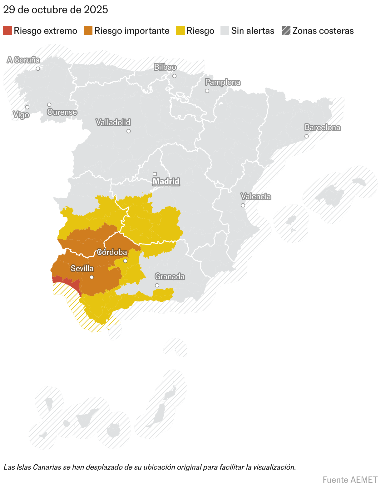 La Agencia Estatal de Meteorología (Aemet) ha activado el aviso rojo este miércoles en el litoral de Huelva por lluvias torrenciales, que pueden llevar a inundaciones y crecidas. El resto de la provincia, Córdoba, Sevilla y Badajoz, se encuentran en nivel naranja por precipitaciones intensas y persistentes. La entidad prevé que llueva en la mayor parte de la Península, excepto en las costas del mediterráneo. El portavoz de la agencia meteorológica, Rubén del Campo, recomienda “extremar las precauciones, evitar zonas bajas y evitar atravesar cauces y barrancos, aunque aparentemente bajen con poca agua” en Extremadura y el oeste y sur de Andalucía.