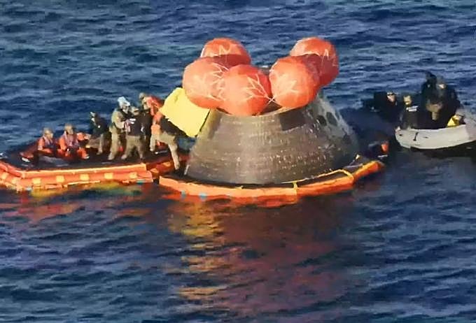 02:07 h: La cápsula Orion ameriza suavemente en las frías aguas del Océano Pacífico, frente a las costas de San Diego, a solo 32 km/h. «Un amerizaje exactamente en el blanco», celebró por radio el Control de Misión.