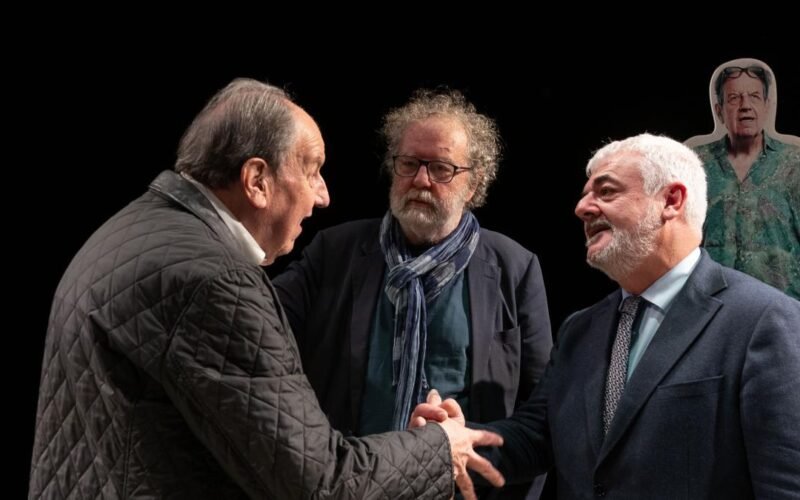 El actor Josep Maria Pou habla al acabar el acto con los periodistas Josep Martí Blanch y John Carlin